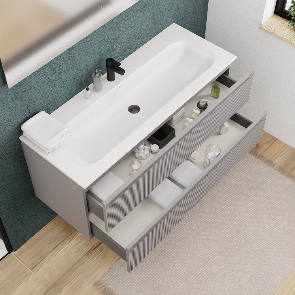 Créez une ambiance lumineuse et raffinée dans votre salle de bain grâce au meuble sous-vasque Ceramia 120 cm en gris perle, au design structuré et épuré.