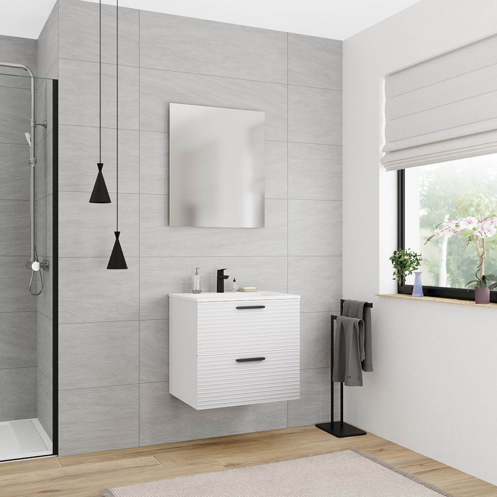 Ce petit meuble salle de bain compact s’adapte parfaitement aux espaces restreints tout en offrant deux tiroirs spacieux pour un rangement optimisé. Son design sobre est rehaussé par une façade finement striée, ajoutant une touche de raffinement discret à votre pièce d’eau.