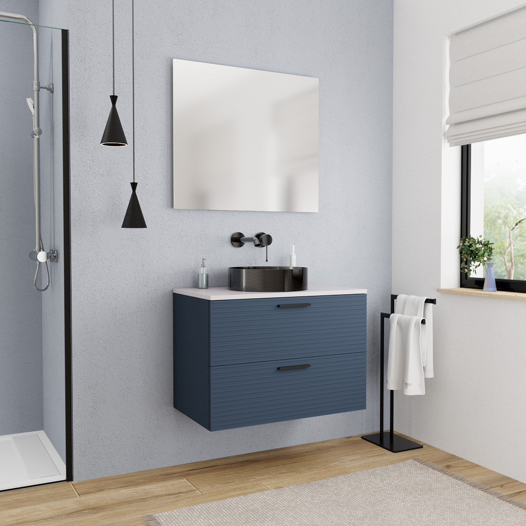 Ceramia Set complet 80 cm : plan vasque blanc mat + meuble assemblé certifié FSC, bleu foncé (CERAMIA-4DB80-S)