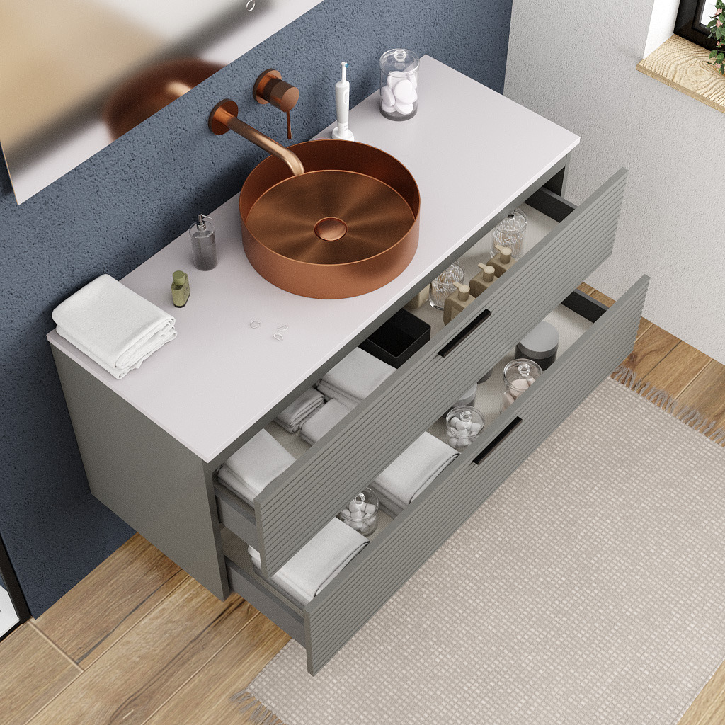 Offrez un look contemporain et affirmé à votre salle de bain avec le set complet Ceramia 120 cm gris foncé, composé d’un meuble suspendu déjà assemblé et d’un plan vasque blanc mat. Son coloris gris foncé mat confère une esthétique moderne et raffinée, idéale pour les ambiances sobres et élégantes. Le plan vasque est fourni non percé, avec un préperçage discret qui vous laisse la liberté d’installer un mitigeur mural ou à poser.