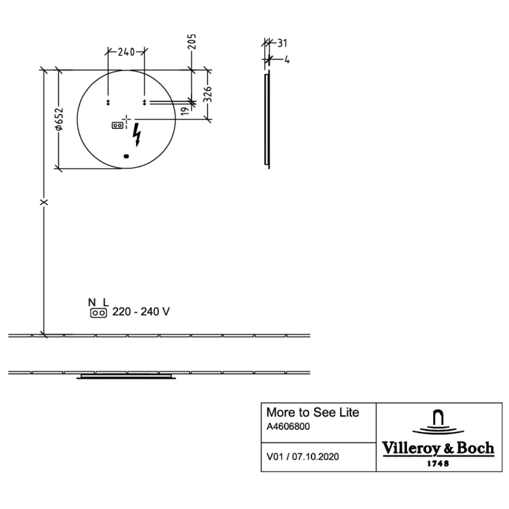 Caractéristiques du Miroir mural avec éclairage LED encastré, 652 x 652 x 31 mm, Classe énergétique A+, Villeroy&Boch More To See Lite (A4606800) :