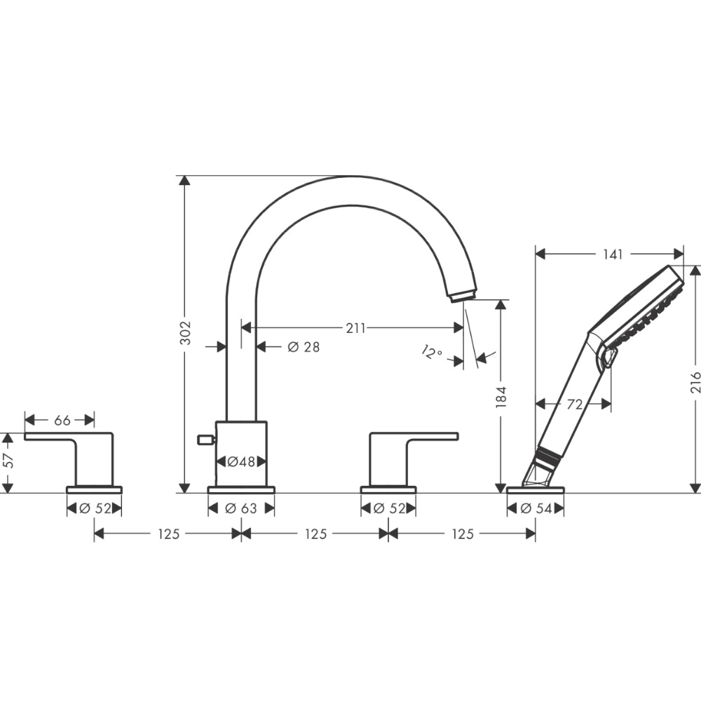 Caractéristiques du Mitigeur bord de baignoire, installation 4 trous, Chrome, Hansgrohe Vernis Shape (71459000)