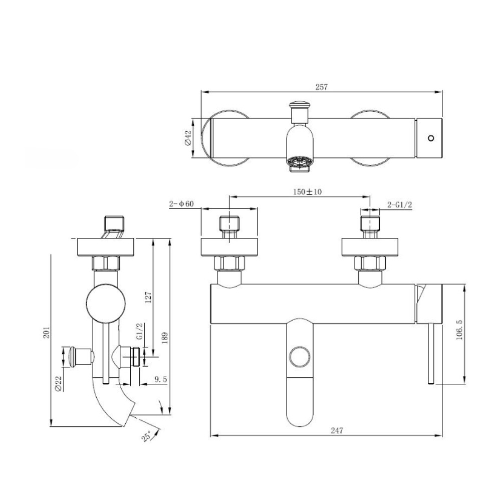 - Espacement entre les robinets : 150 mm