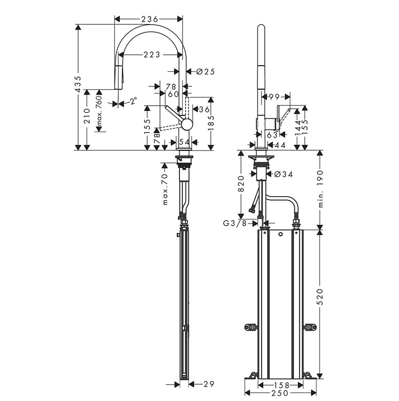 Caractéristiques du Mitigeur de cuisine 210, avec douchette extractible 2 jets, Noir mat (72800000) :