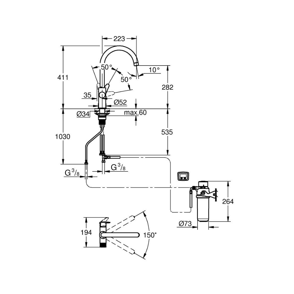 Caractéristiques du kit de démarrage avec filtre charbon compact, chrome Grohe Blue Pure StartCurve (G30593000) :