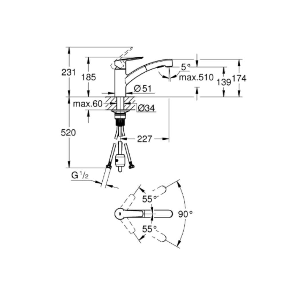 Caractéristiques du mitigeur cuisine 1/2" à bec bas avec double douchette, Grohe Start, chrome (G30381001):