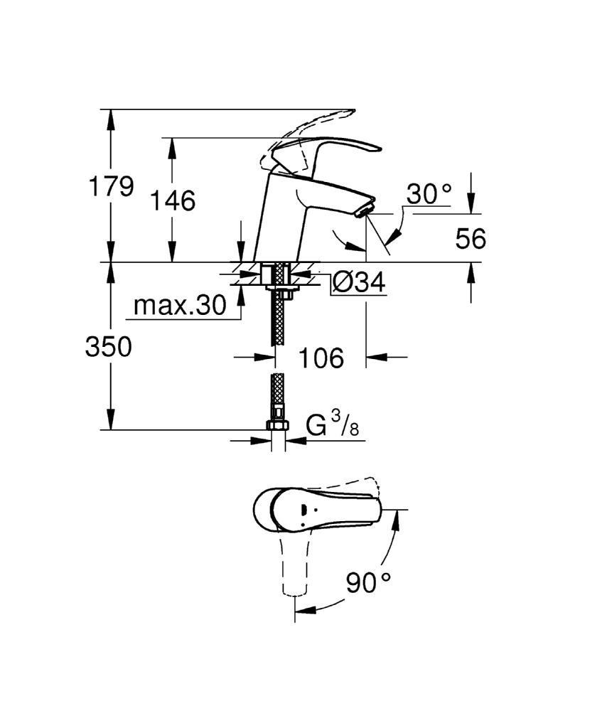 Caractéristiques du mitigeur monocommande 1/2" lavabo Taille S Grohe Eurosmart :