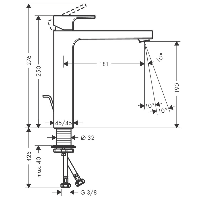 Caractéristiques du Mitigeur de lavabo 190, avec tirette et vidage synthétique, Chrome, Hansgrohe Vernis Shape (71562000) :
