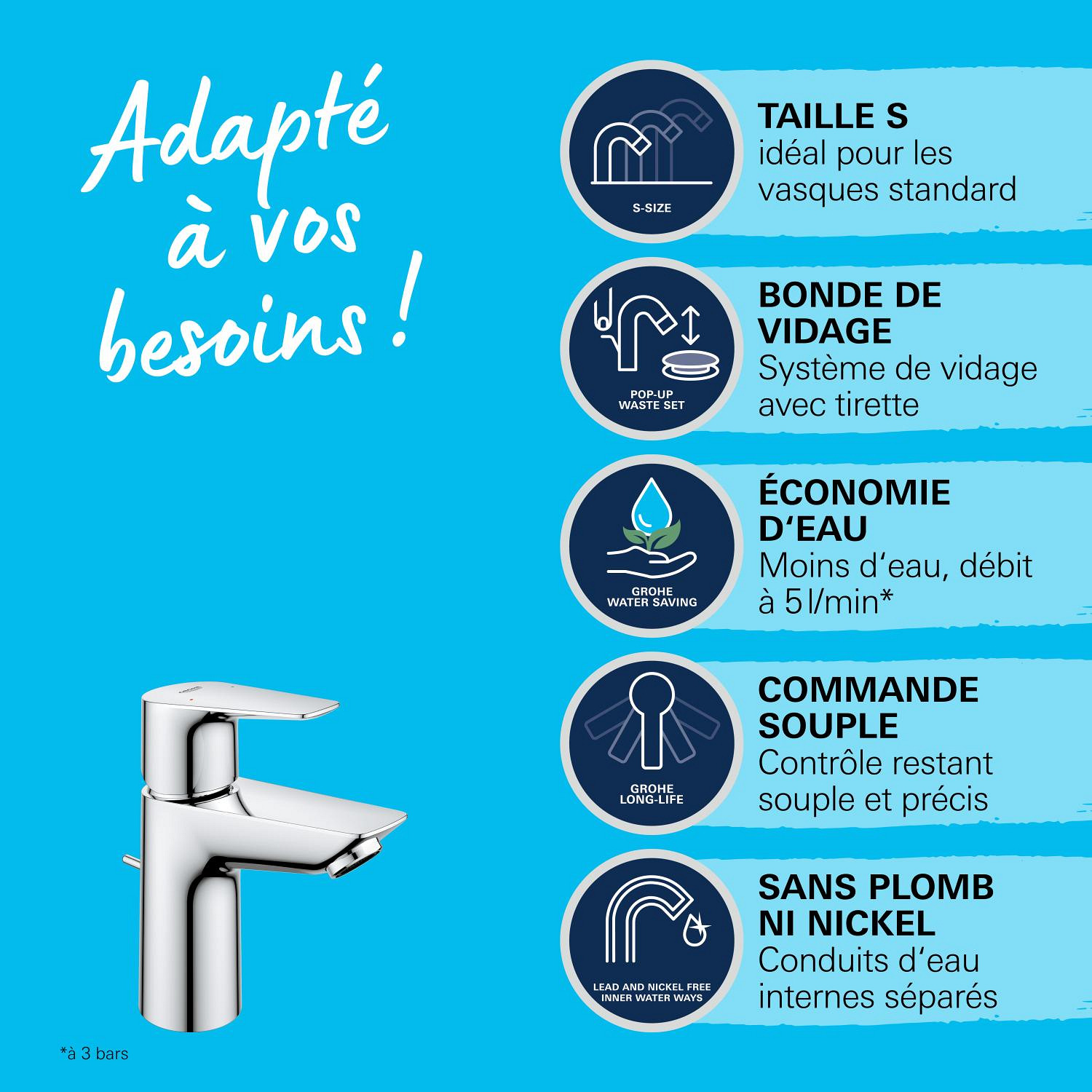 Caractéristiques du Mitigeur monocommande lavabo START EDGE avec vidage, Taille S, Chrome (24196001) :