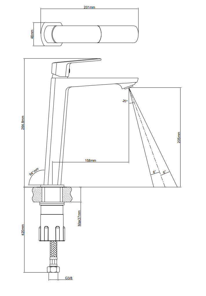 - Hauteur du mitigeur: 26,4 cm