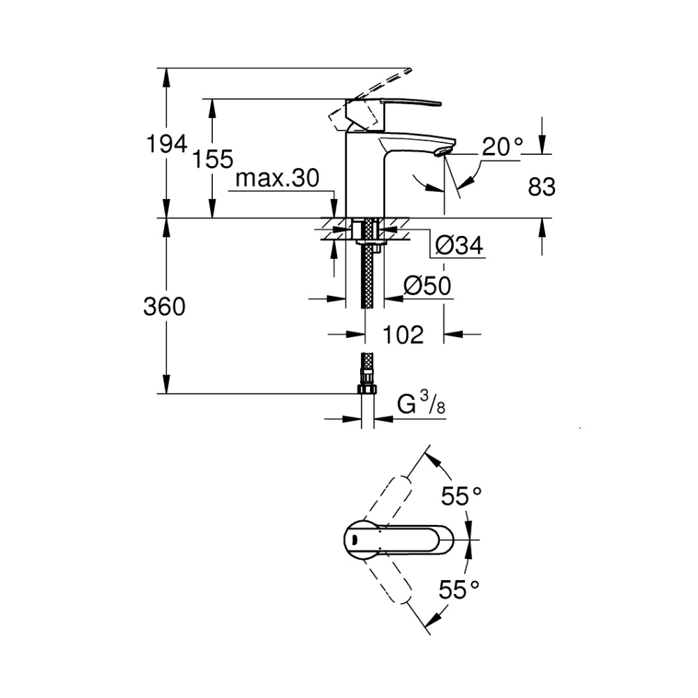 Caractéristiques du mitigeur de lavabo 1/2", taille S, Grohe Wave Cosmopolitan, chrome (G23225000) :