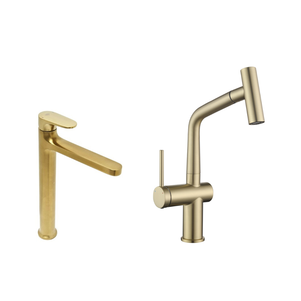 Dark set mitigeur lavabo XL + mitigeur cuisine Ceramia Timeless acier inoxydable, douchette extractible, or (SATTMLDA1285BG)