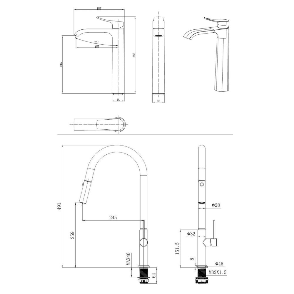 set mitigeur lavabo haut + mitigeur cuisine avec douchette extractible et bras pivotant, chrome (SATINFBSD285)