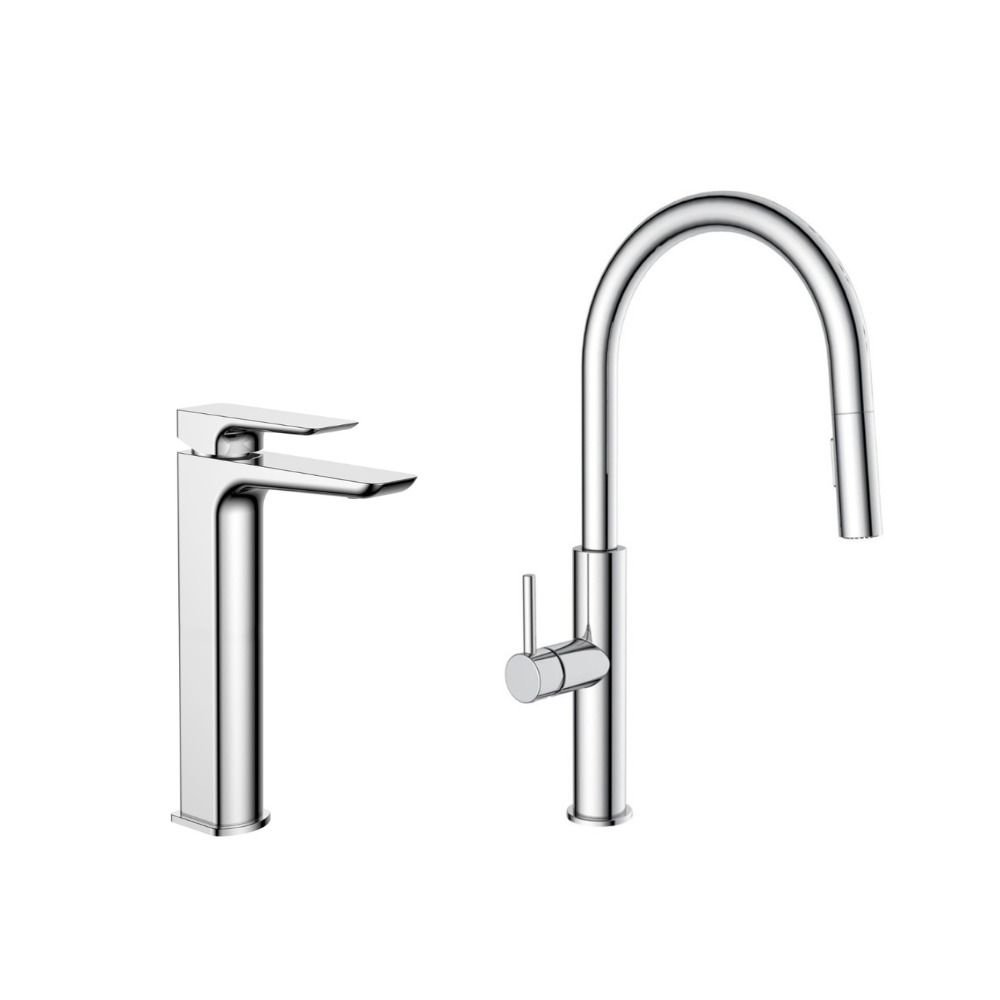 set mitigeur lavabo haut, sans vidage + mitigeur cuisine avec douchette extractible 2 jets, chrome (SATBSBD285)