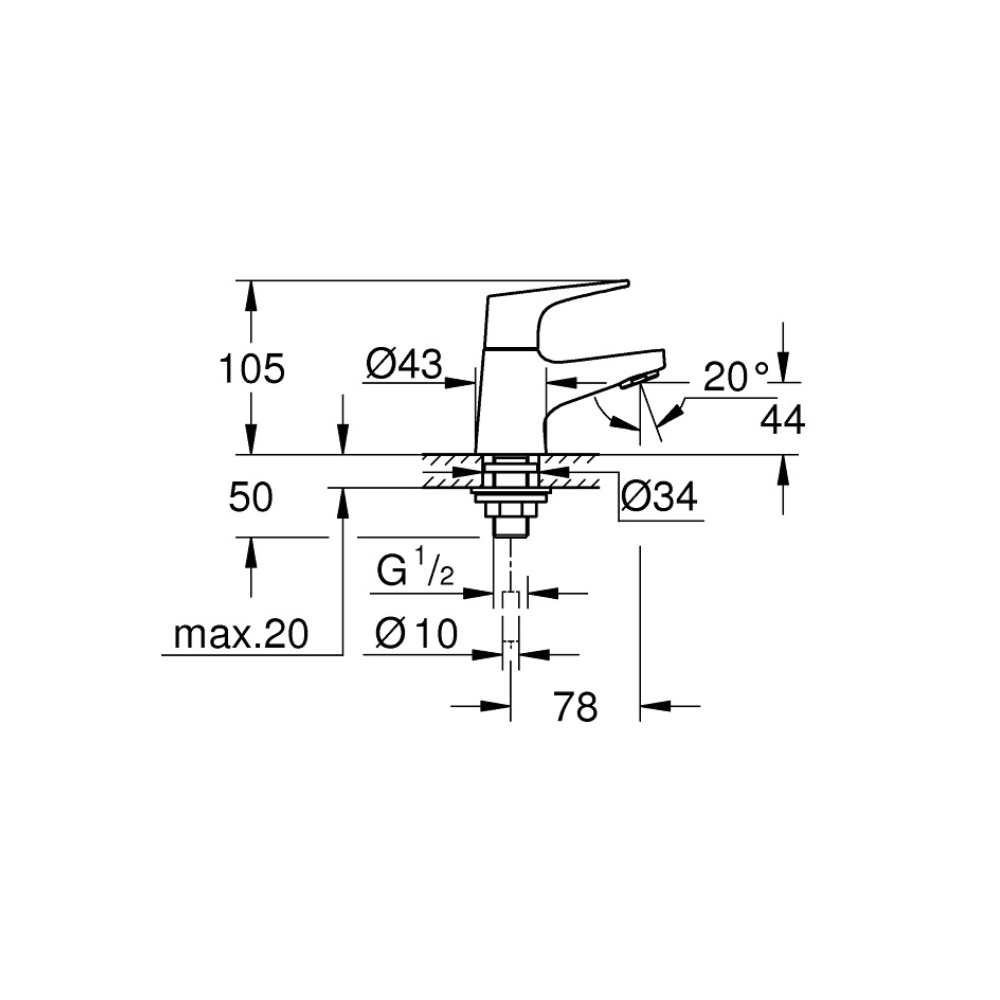 Caractéristiques du robinet monofluide lave-mains taille XS, Grohe Start Flow, chrome (G20577000) :