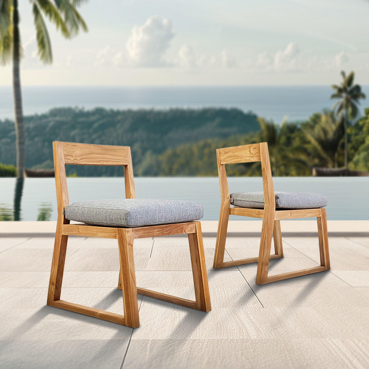 Lot de 2 chaises de jardin en teck massif avec coussins gris – élégance naturelle pour des moments d’été en extérieur (NATOFCH50B-DUO)