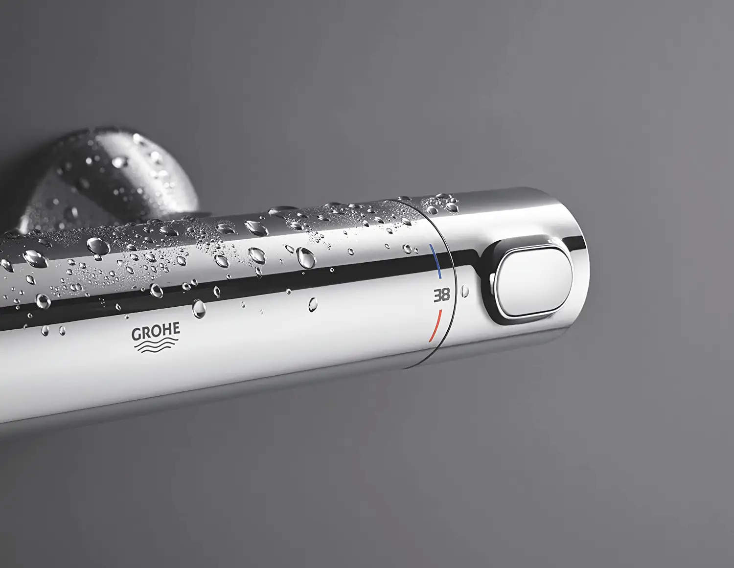 Le mitigeur thermostatique Grohe est équipé des technologies SafeStop, butée à 38°C, et SafeStop Plus, limiteur de température à 43°C qui minimisent les risques de brûlures. Le GROHE StarLight assure la durabilité et l'éclat du chrome.