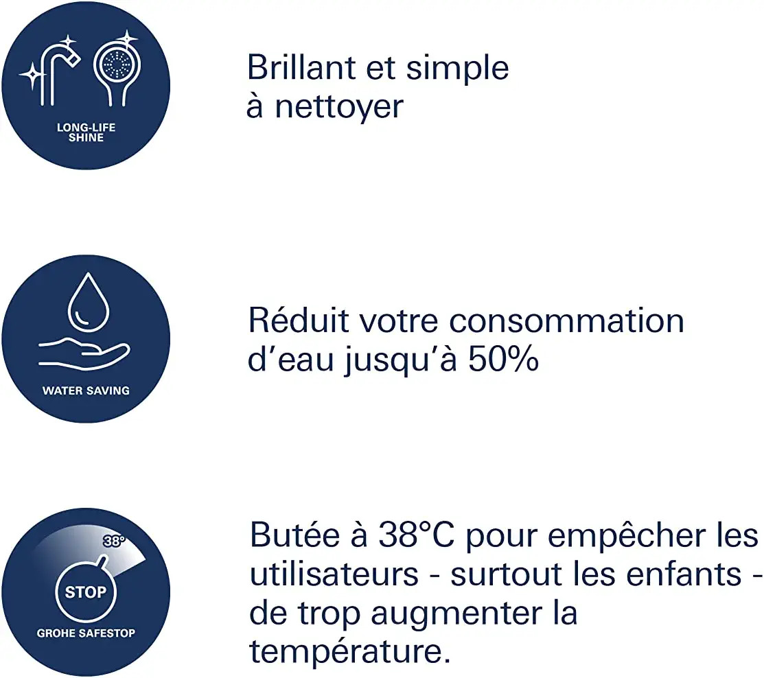 - GROHE SafeStop : Permet de régler une température maximale de 38°C pour éviter les brûlures.