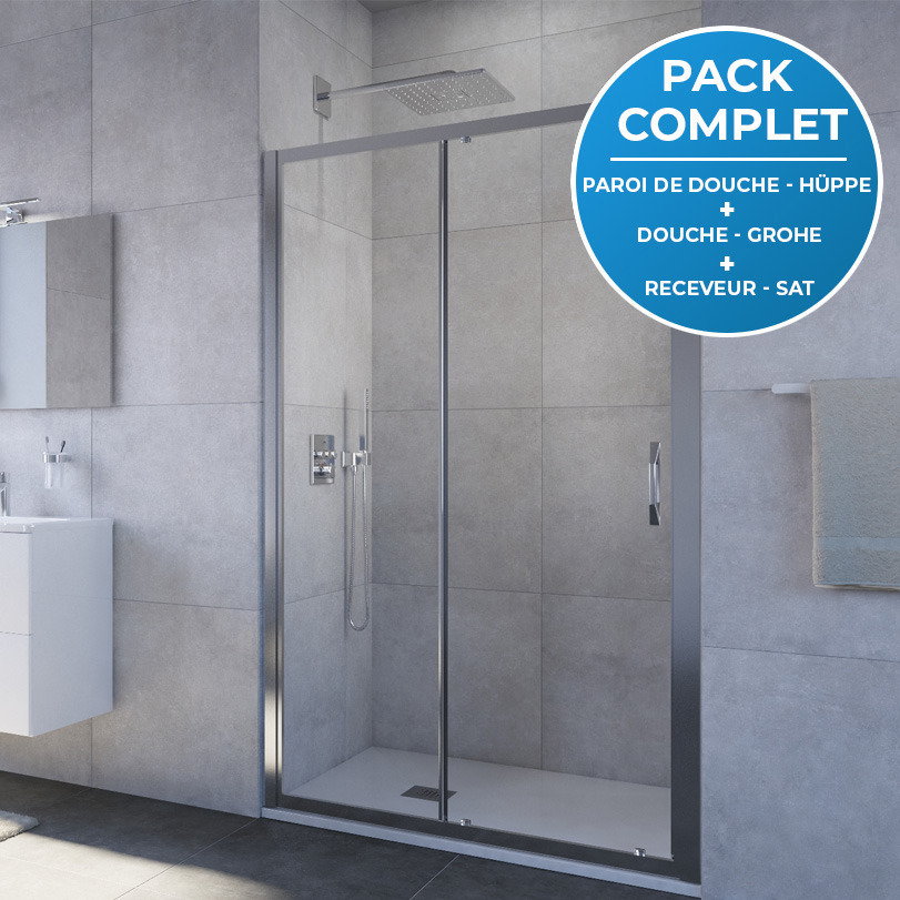 HÜPPE Pack douche : Porte coulissante 120cm + Set de douche encastré Grohe + Receveur 120x80cm Blanc