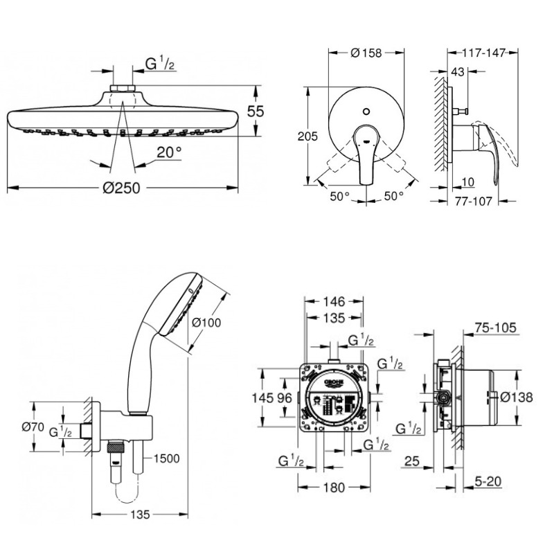 Grohe Eurosmart Set de douche encastré avec douche de tête XXL 250, Douchette 2 jets et support de douche mural, Chrome (25219001-XXL)