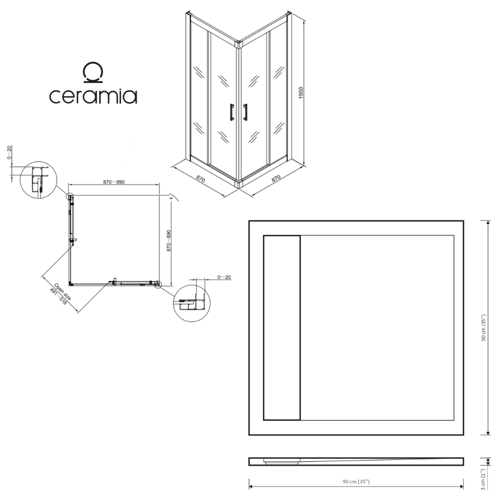 Caractéristiques de la porte coulissante 90x90 + receveur gris avec siphon (HCB-ALD15G-9090) :