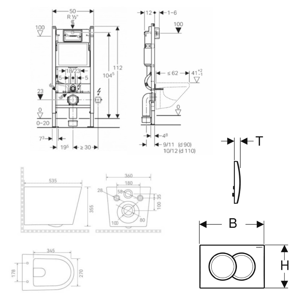 Caractéristiques du pack WC bâti-support Geberit Duofix 112cm + WC suspendu sans bride Ceramia + abattant SoftClose + Set habillage + plaque blanche (CETORGEB3SBVP) :