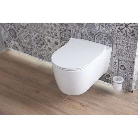 WC suspendu sans bride avec fixations invisibles + abattant ultra fin déclipsable avec frein de chute (AlfaRimless) :
