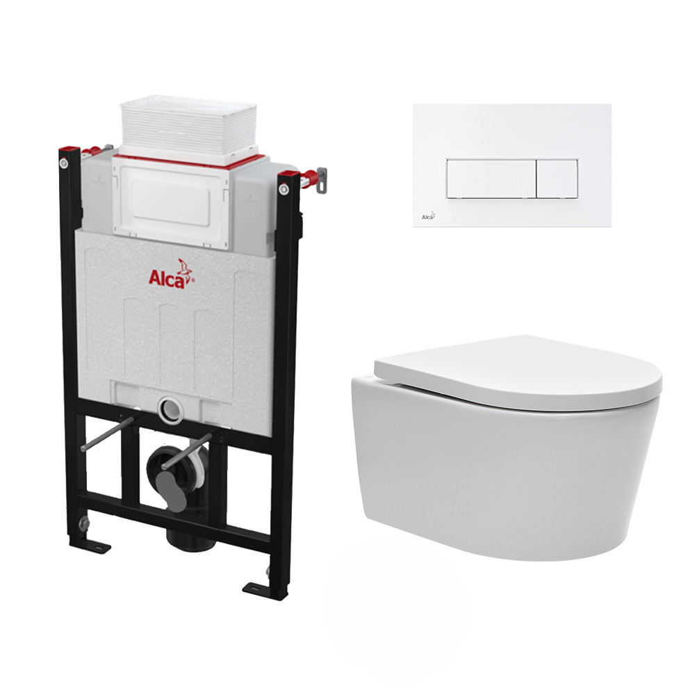 Alca Pack Bâti 85cm + Cuvette sans bride et fixations invisibles avec abattant frein de chute + Plaque blanche (Alca85SatRimless-4)