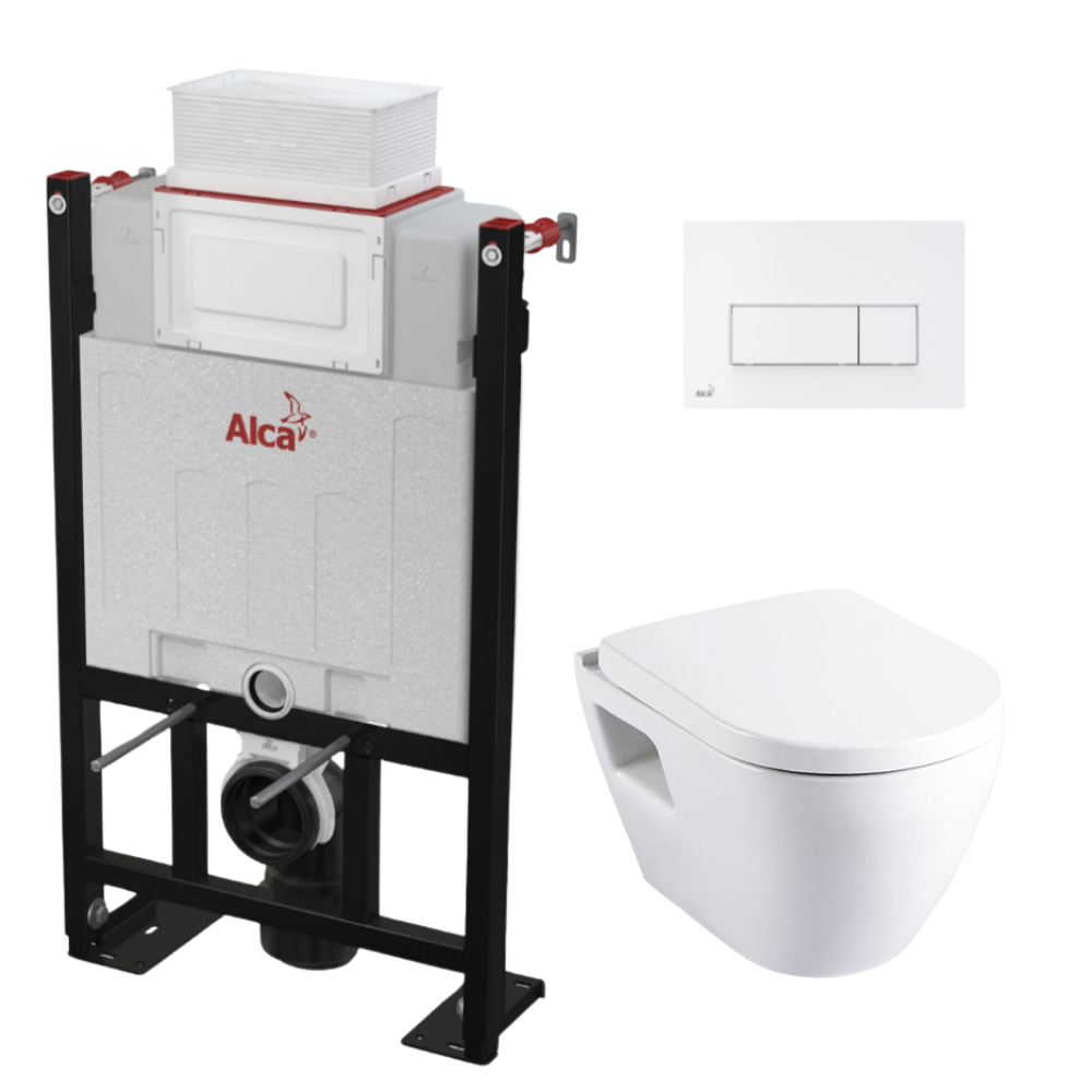 Alca Pack WC Bâti 85 cm autoportant avec cuvette Serel SM26 sans bride + Abattant softclose + Plaque blanche (Alca85FSM26-4)