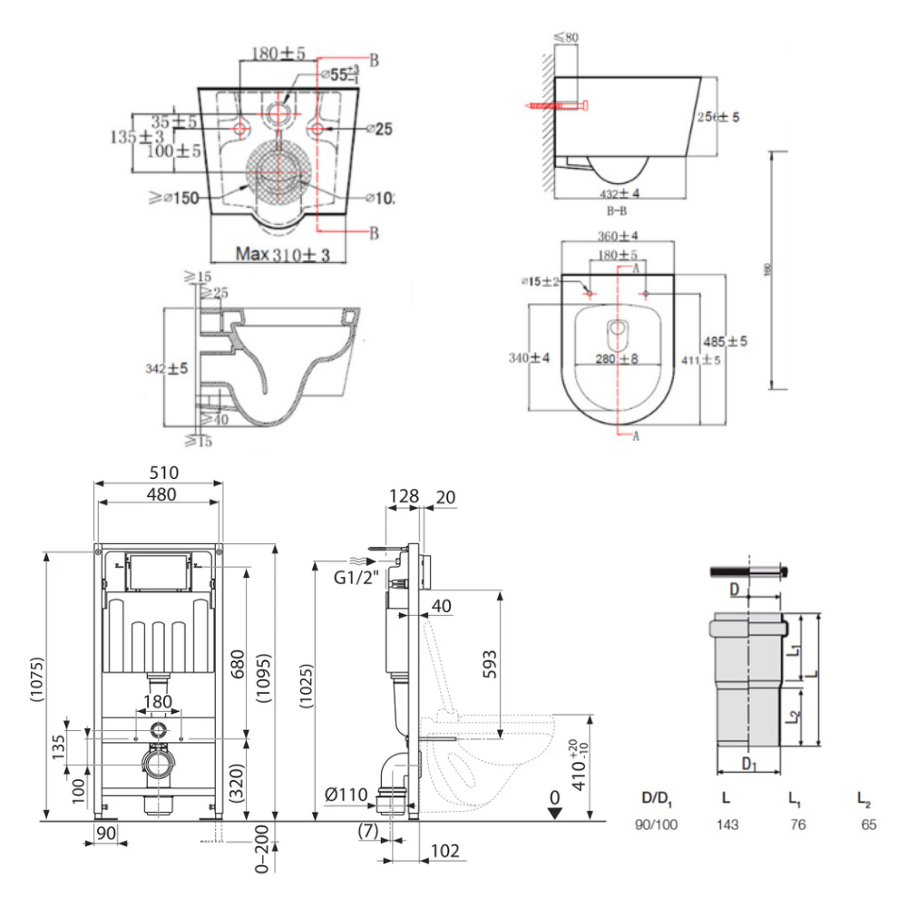 - Plage de réglage devant mur : 135-205mm (lorsque monté sur des supports muraux)