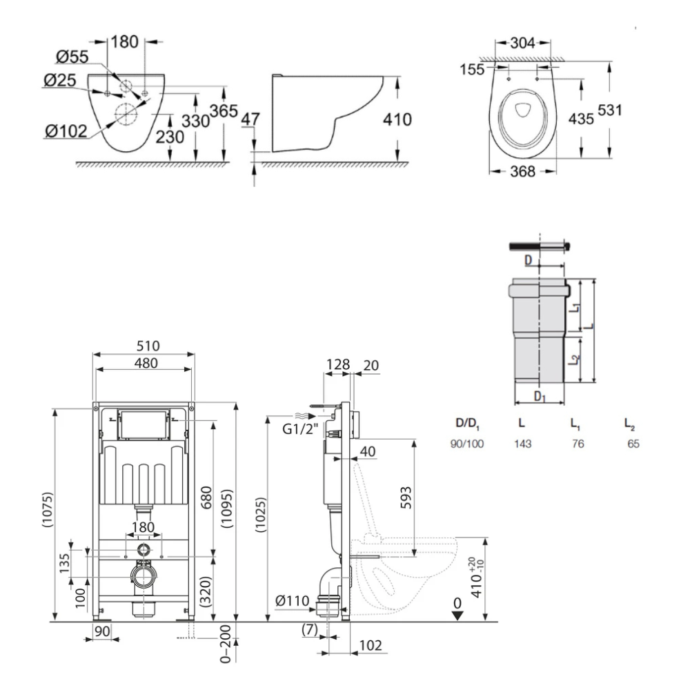 - Plage de réglage devant mur : 135-205mm (lorsque monté sur des supports muraux)