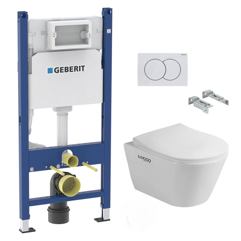 Pack WC Bati-support Geberit Duofix + WC sans bride Lucco Avva + Abattant softclose + Plaque blanche (AvvaGeb3)