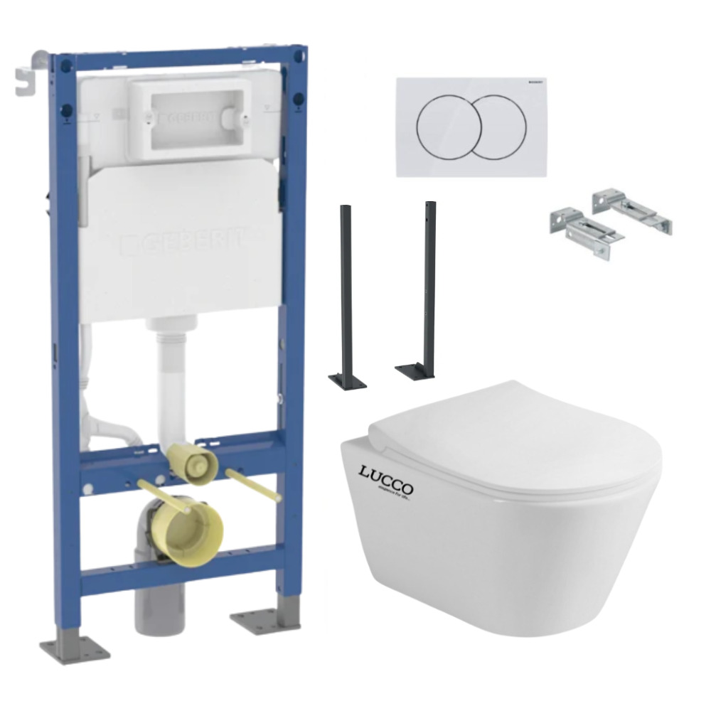 Caractéristiques du Pack Autoportant Bâti-support Duofix + WC sans bride Lucco Avva + Abattant softclose + Jeu de pieds autoportants pour bâti-support Geberit Duofix + Plaque blanche (AvvaGebX) :