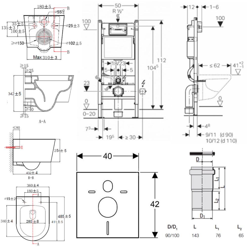Caractéristiques du Pack Bâti-support 112cm + Cuvette Swiss Aqua Technologies sans bride + Plaque blanche + Set d'isolation phonique (SATrimlessGeb3SET) :