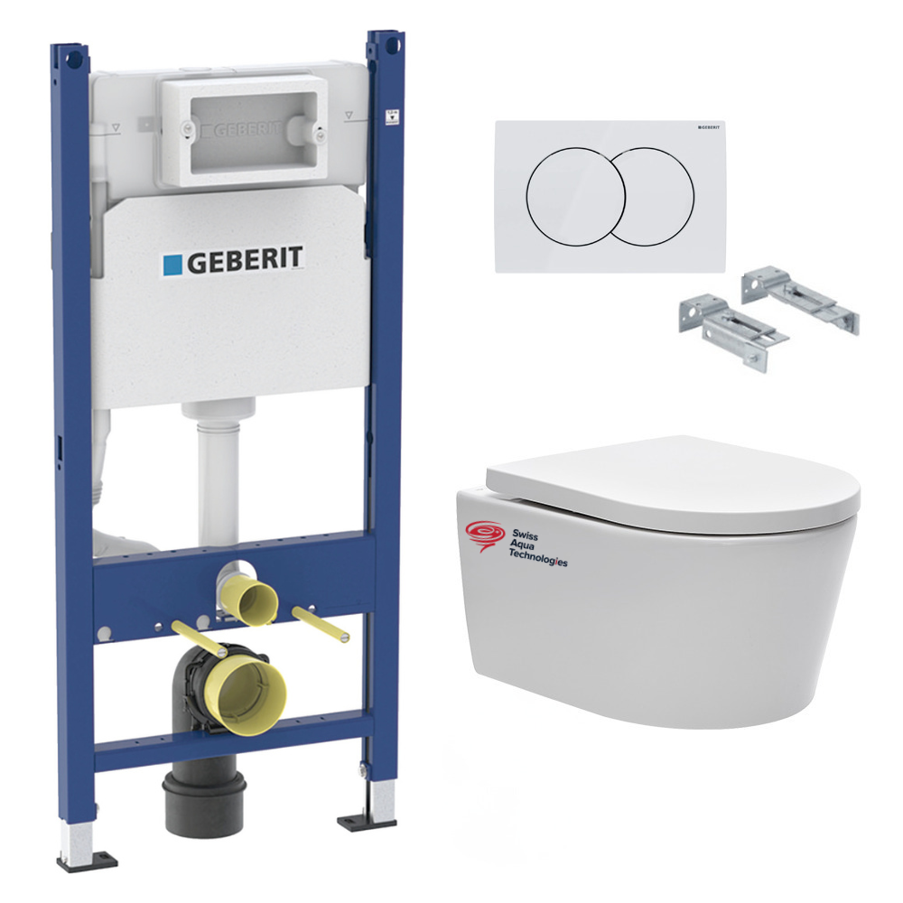 Pack Bati-support Geberit 112cm + WC sans bride Swiss Aqua Technologies + Plaque blanche + Set d'isolation (SATrimlessGeb3SET)