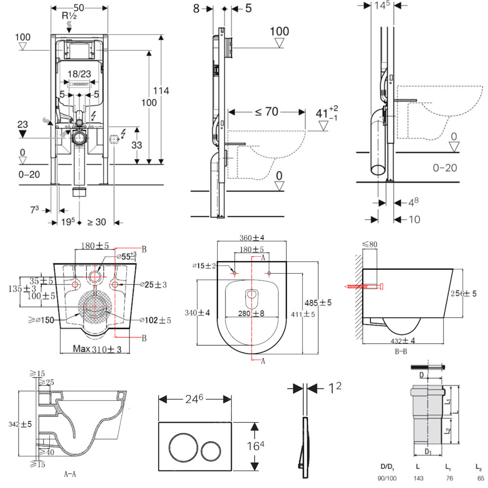 • Profondeur des plaques de pied adaptée à l'installation sur profilés en U UW 50 et rails pour système Geberit Duofix