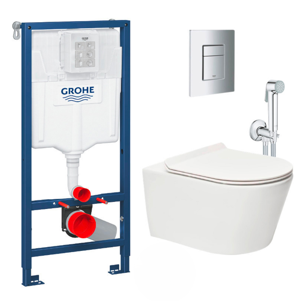 Grohe Pack WC Bâti-support Rapid SL + WC sans bride Brevis + Abattant softclose + Douchette bidet + Plaque chrome