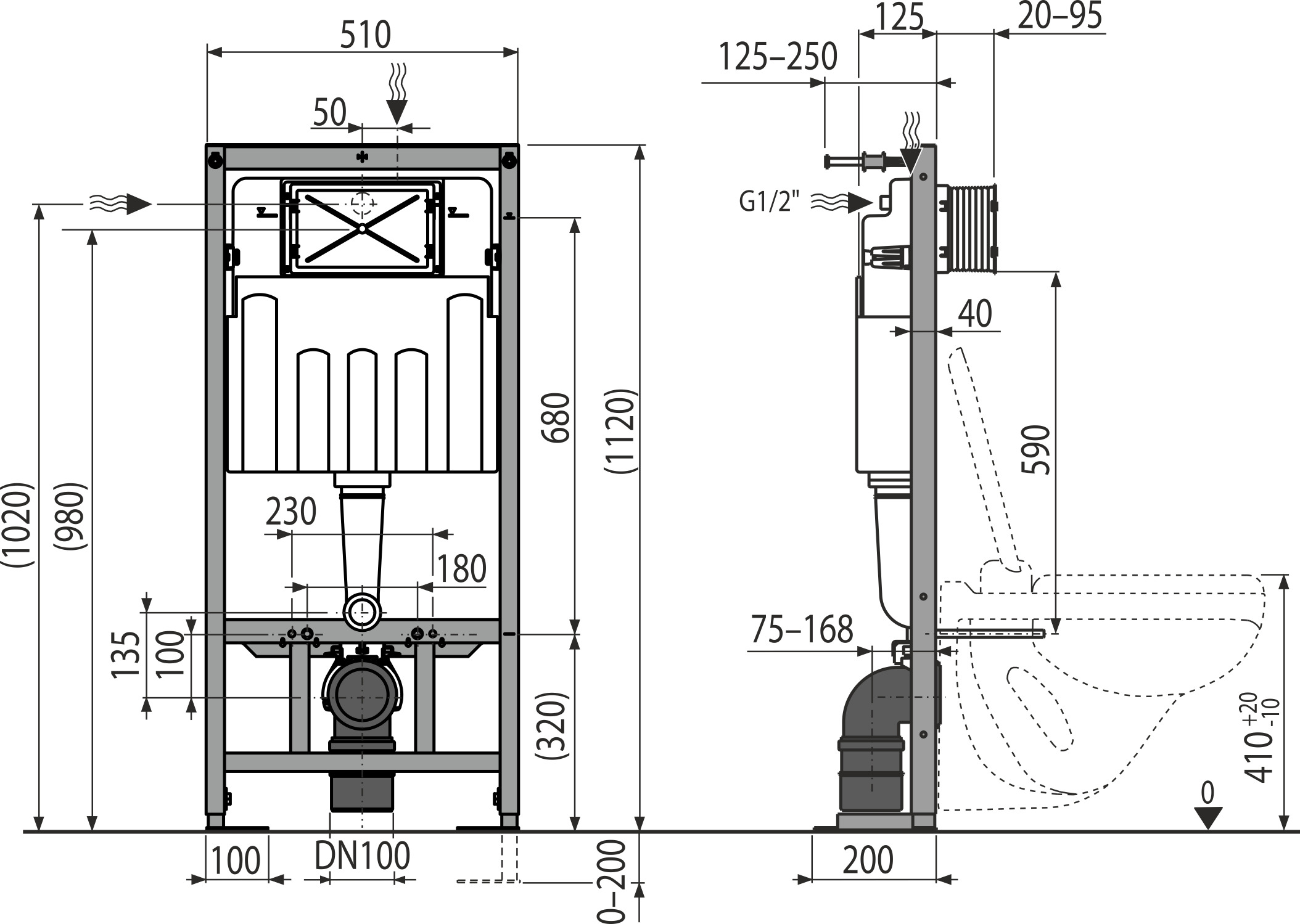 - Dans le cas d’une fixation à 320 mm du sol fini, la hauteur du siège sans abattant sera de 400mm et la distance entre le fond de la cuvette et le sol fini sera de 60 mm.