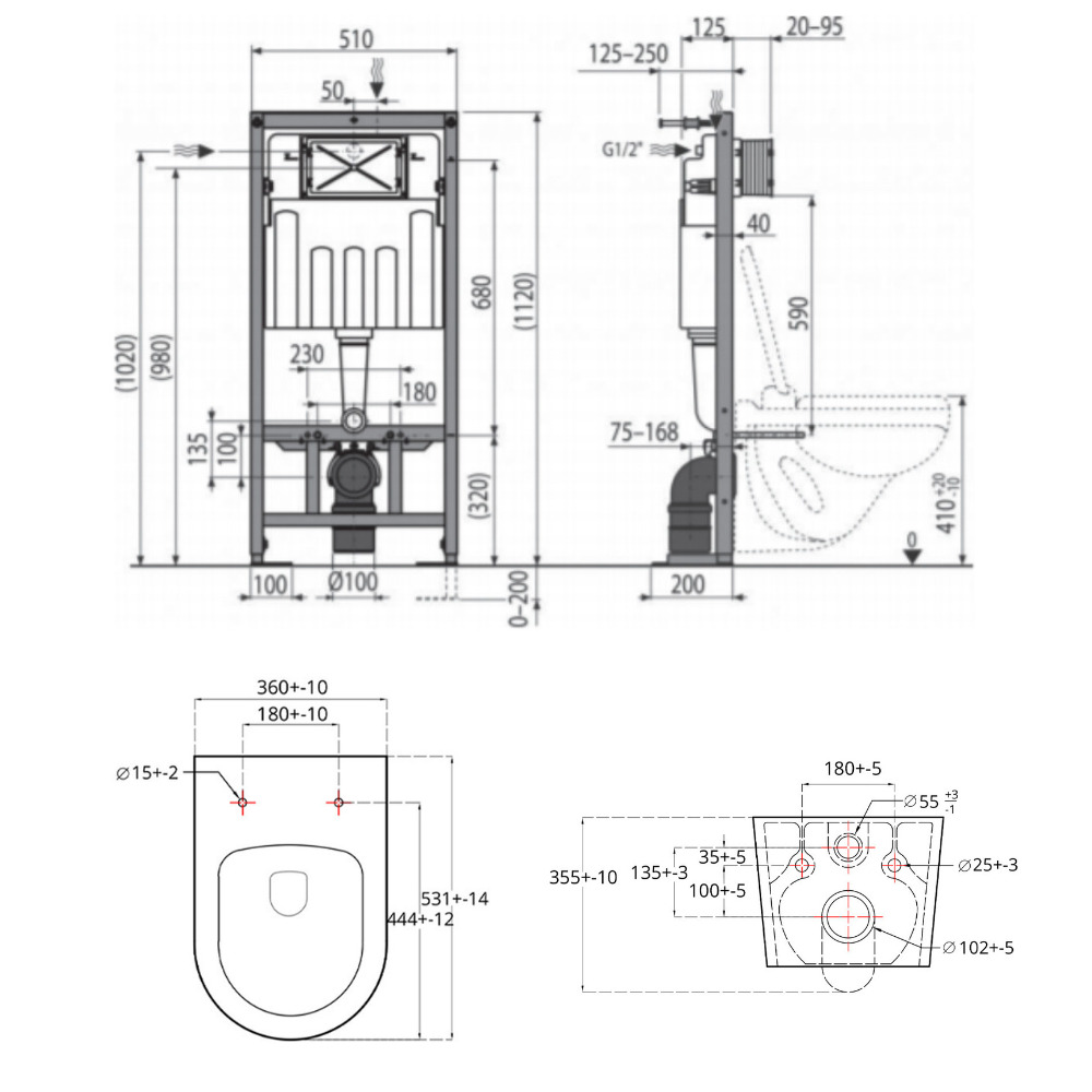 - Pour le montage de cuvettes WC suspendues avec un pas de raccordement de 180 mm ou 230 mm