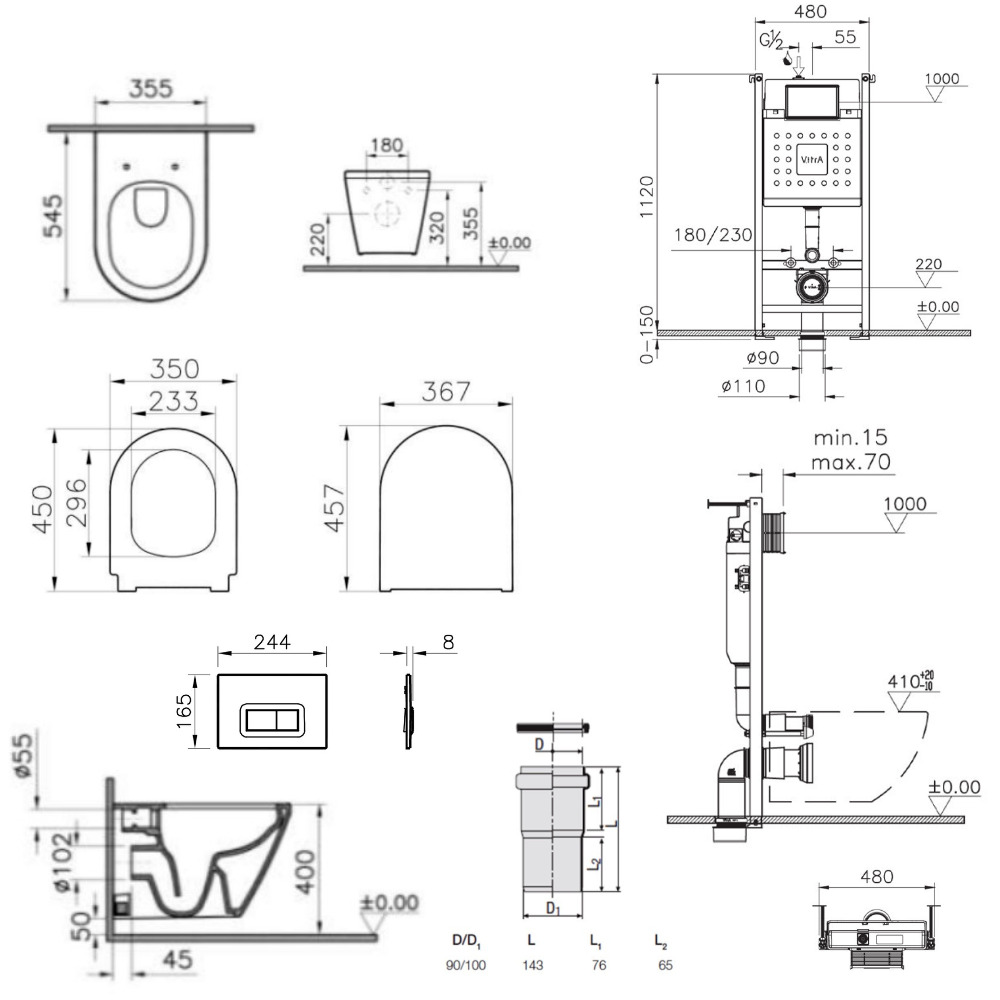 Vitra Pack WC Bâti-support V-Fix Core + WC sans bride Integra, fixations invisibles + Plaque, Blanc Brillant (V-FixIntegraRimless-1)