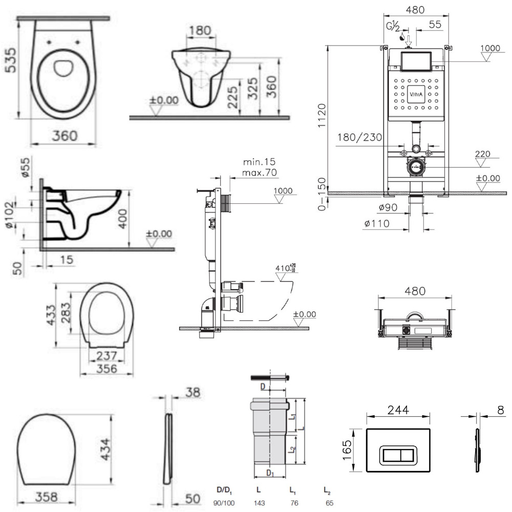 Vitra Pack WC Bâti-support V-Fix + WC sans bride Vitra Normus + Abattant SoftClose + Plaque, Blanc Brillant (V-FixNormusRimless-1)