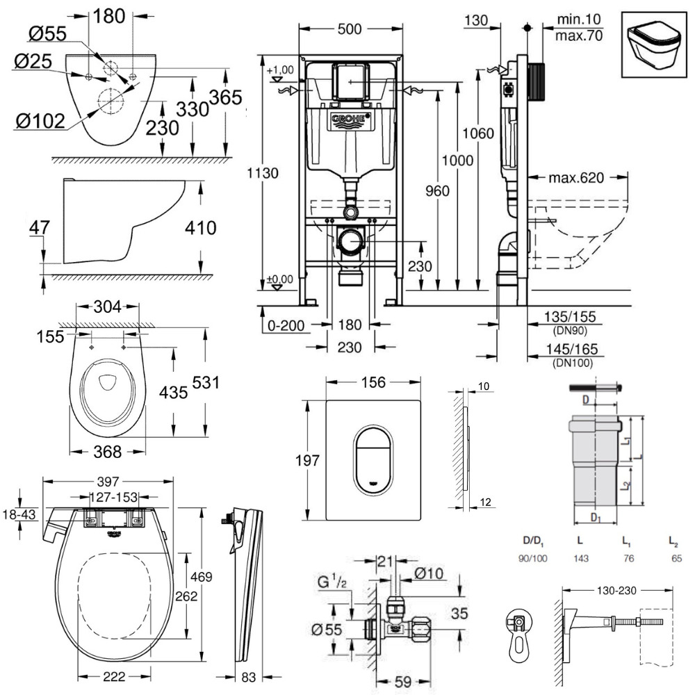 Caractéristiques du Pack WC Rapid SL + WC Bau Ceramic sans bride + Abattant lavant + Plaque Chrome + Set d'isolation phonique (39418000-Premium) :