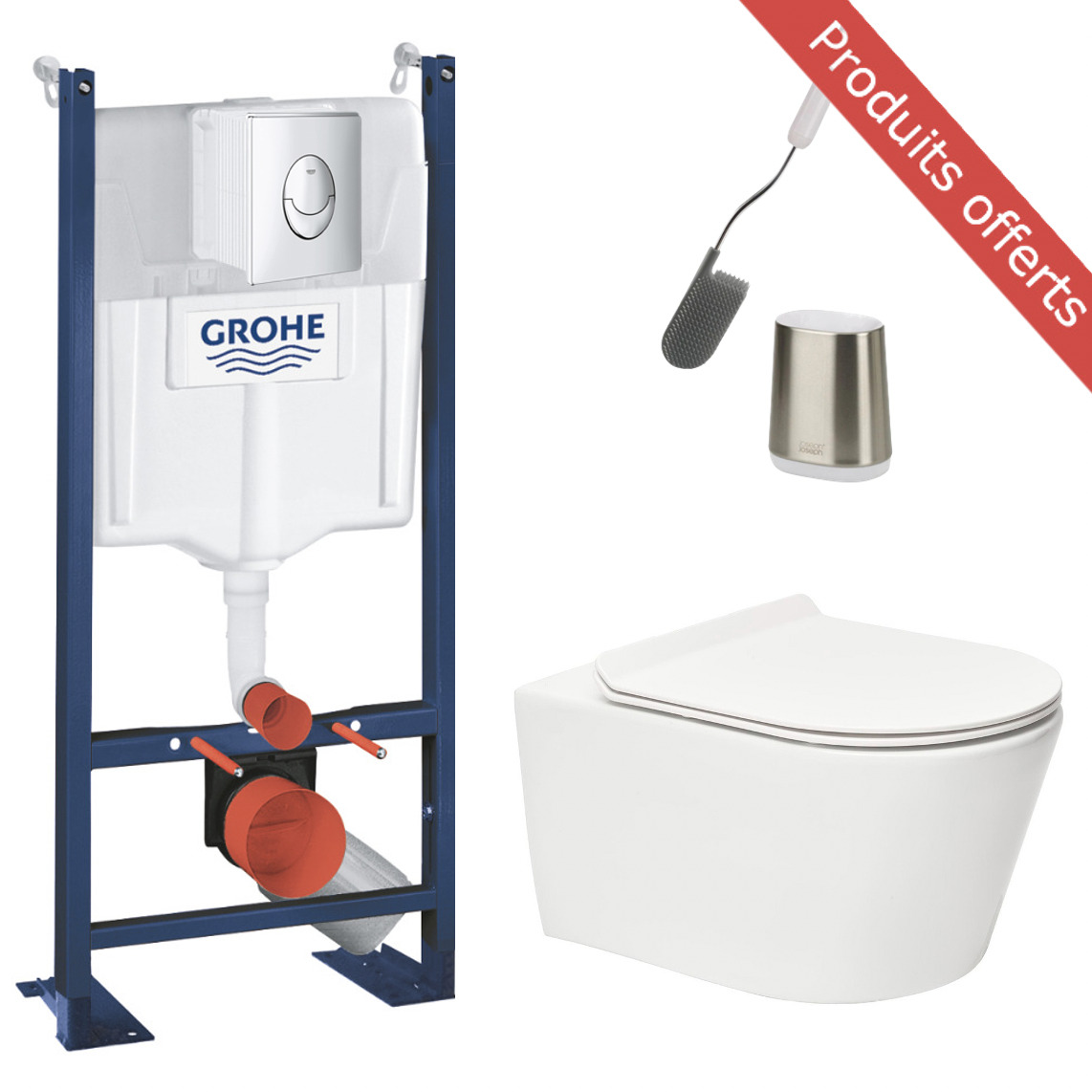 Grohe Pack WC Bâti autoportant + WC sans bride SAT Brevis + Abattant SoftClose + Plaque Chrome + Brosse Joseph Joseph OFFERTE