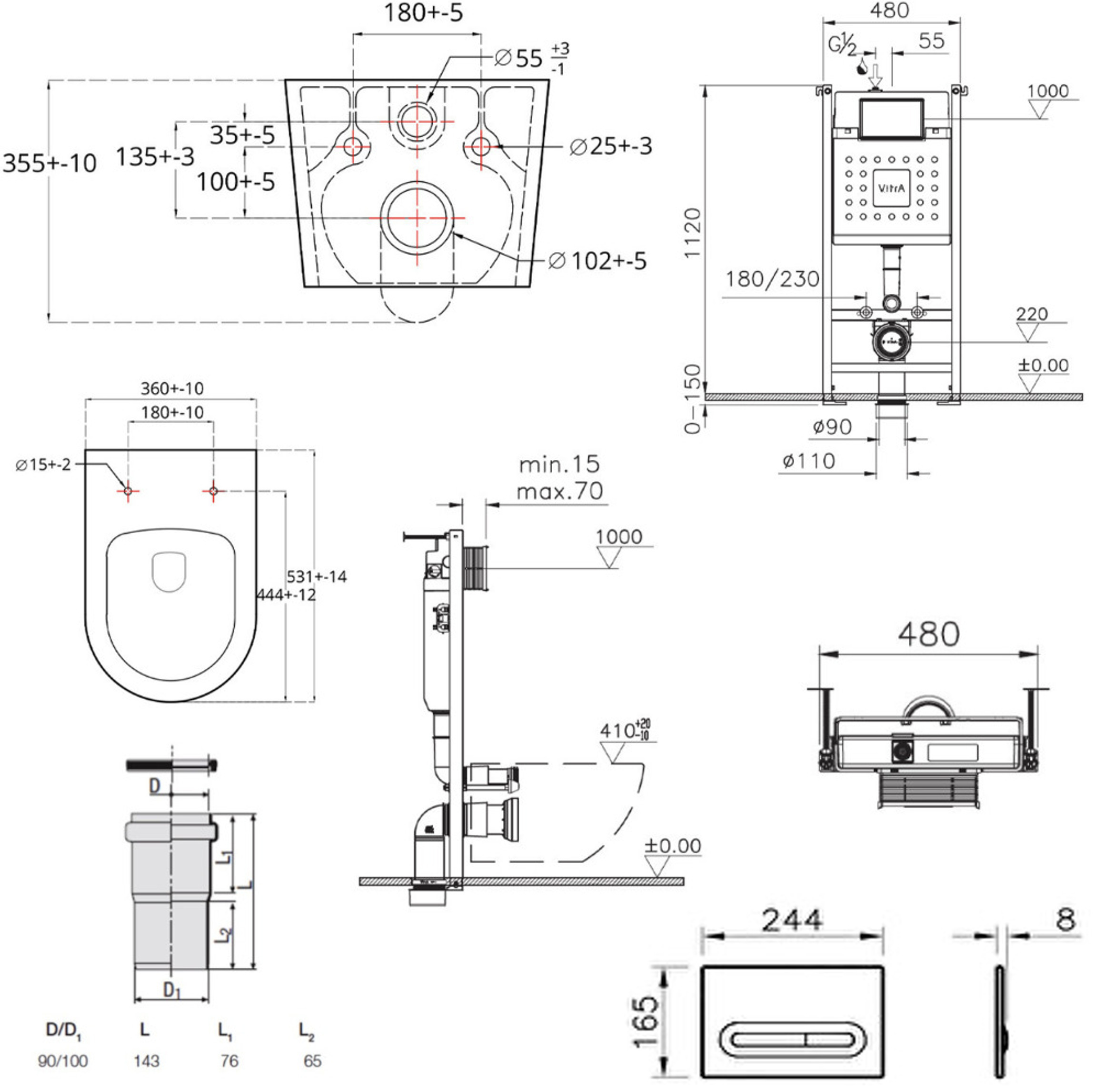 Caractéristiques du Pack WC Bâti-support V-Fix Core + WC sans bride SAT Brevis + Plaque Chrome mat (V-FixBrevis-5) :
