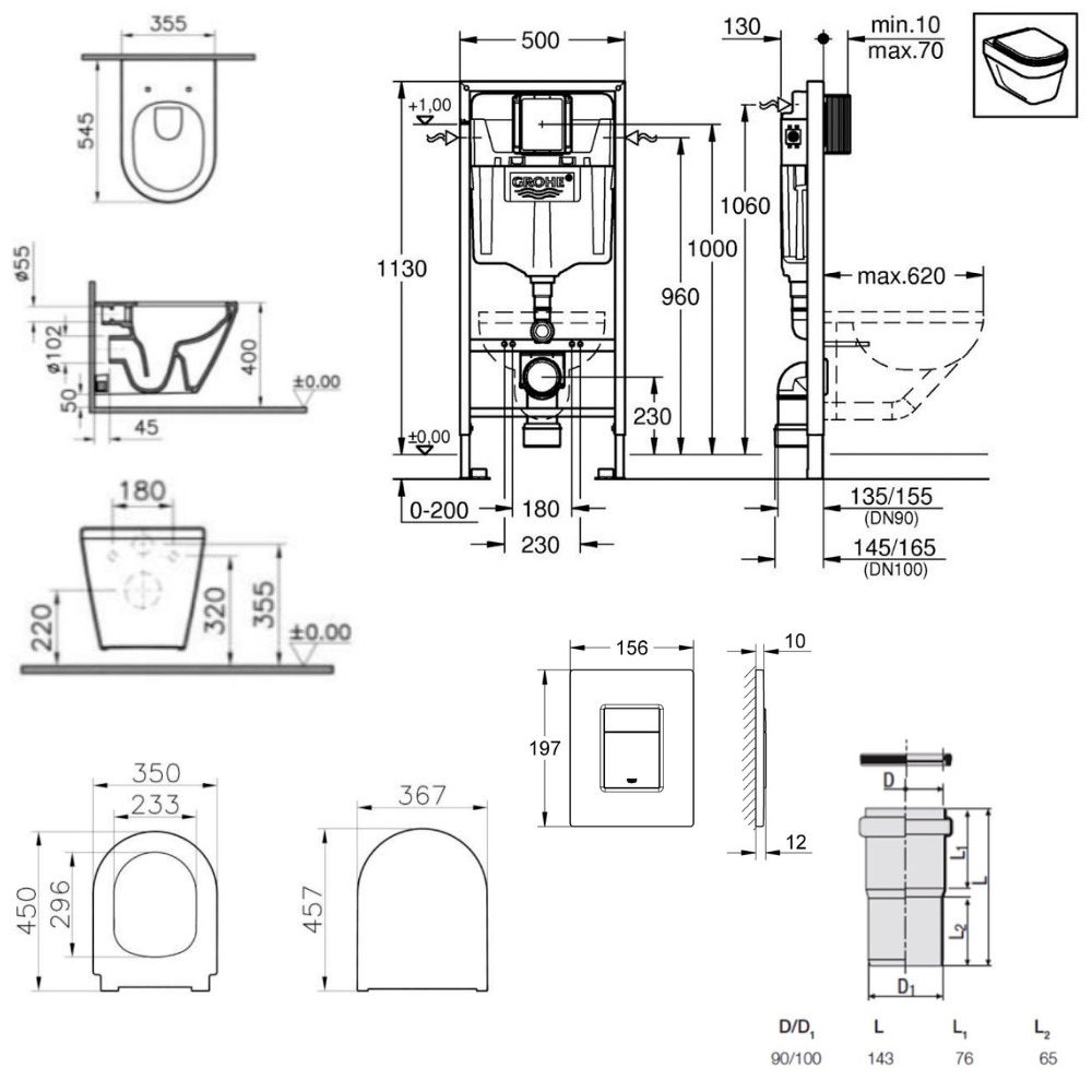 Caractéristiques du Pack WC bâti-support Grohe Rapid SL + WC sans bride Vitra Integra + Abattant SoftClose + Plaque noir mat (RapidSL-BlackIntegra-KF0) :