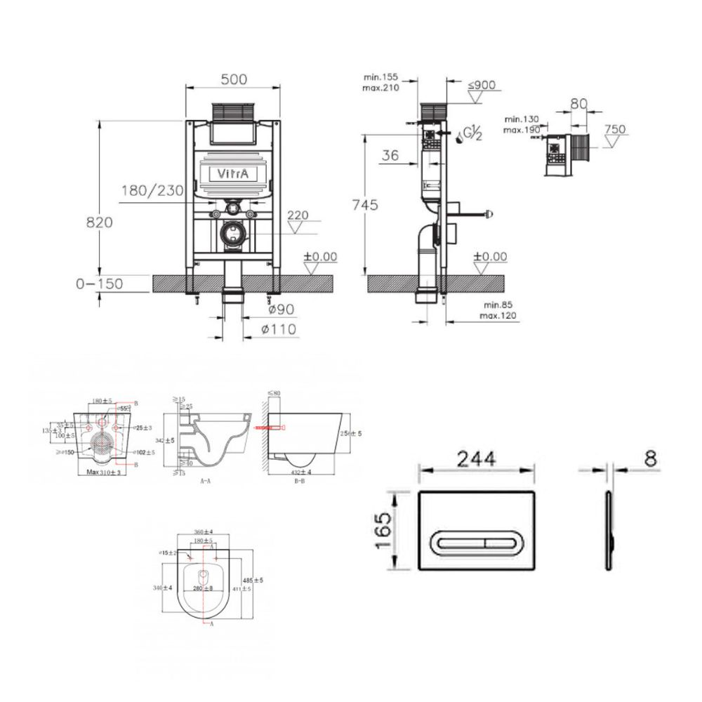 Vitra Bâti support 82cm + WC sans bride SAT + Abattant softclose + Plaque noir mat (VUNI82BLACKSATRIMLESS-6)