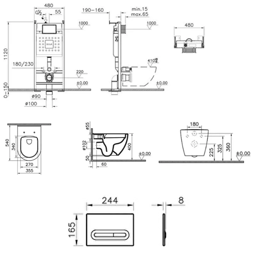 Vitra Pack WC Bâti-support autoportant V-Fix Core + WC sans bride Vitra S60 + abattant + Plaque chrome mat (VFTFS60-5)