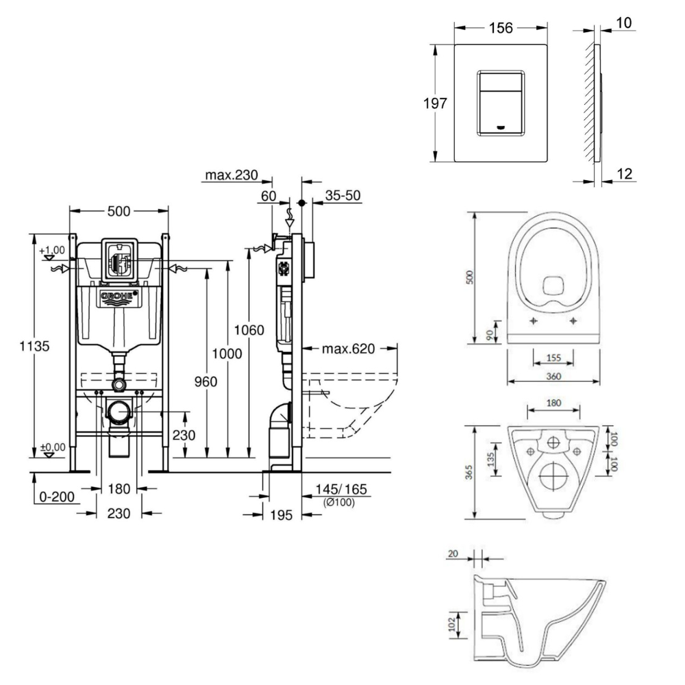 Caractéristiques du pack WC Bâti-support autoportant Grohe Rapid SL + Cuvette sans bride Cersanit + Abattant SoftClose + Plaque chromé mat (PROMILLE5SP) :