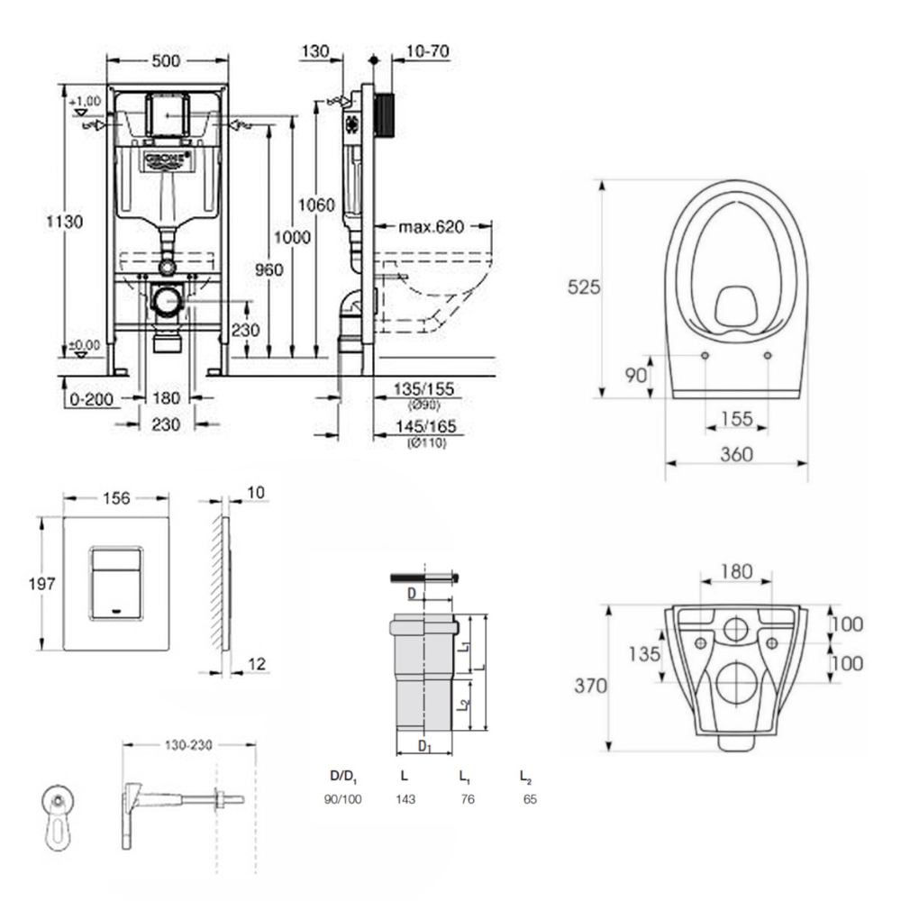 Caractéristiques du pack WC Bâti-support Grohe Rapid SL + Cuvette sans bride Cersanit + Abattant SoftClose + Plaque chrome (RAPIDSL-MODUO) :
