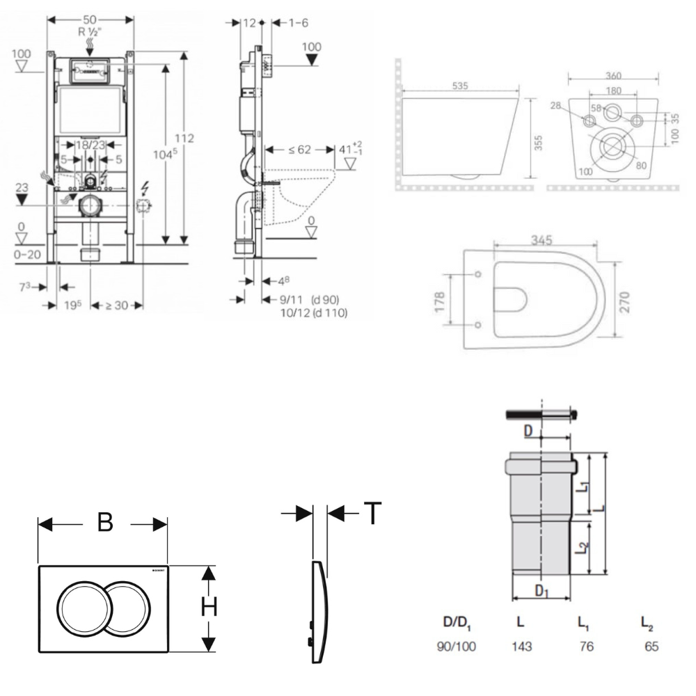 Caractéristiques du pack WC bâti-support Geberit Duofix 112cm + WC suspendu Ceramia Tornado Rimless + abattant SoftClose + plaque blanche (CETORGEB3) :